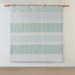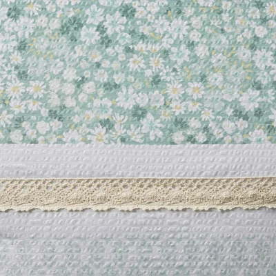 Featuring three different floral and botanical print designs separated by lace trims, this Madison Park seersucker microfiber comforter set exudes shabby chic/farmhouse style that adds a touch of elegance to any bedroom. The two decorative pillows feature gathered fabric and embroidery with lace trim and ruffles, adding to the overall charm of the set. Colors featured in this set include various shade of greens, yellows, and whites.