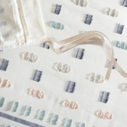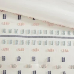 The Urban Habitat Auden 5 Piece Cotton Jacquard Duvet Cover Set offers a chic contemporary update to your bedroom decor. This cotton jacquard duvet cover features multicolor clipped stripes in blue, aqua, and pink on a light ivory ground for a textural modern look. Two matching shams mirror the design of the duvet cover, while a square and an oblong pillow provide the perfect finishing touches to the casual duvet cover set. This bedding set is OEKO-TEX certified, meaning it does not contain any harmful substances or chemicals to ensure quality comfort and wellness. Button closures on the duvet cover secure a comforter insert (NOT included) within the duvet cover and internal corner ties prevent it from shifting.