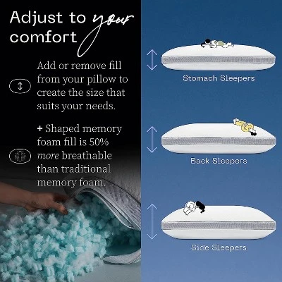 - You Sleep You: Be you with our adjustable pillow. Simply unzip the cover, add or remove stuffing to match your comfort level & get ready to sleep better! Personalize it the way you want it; each package comes with a 0.5 lb bag of fill. Our Cool+ pillows also have 2 sides to choose from for a good night’s sleep; the cushy cool side & the firm, supercooled pad side.