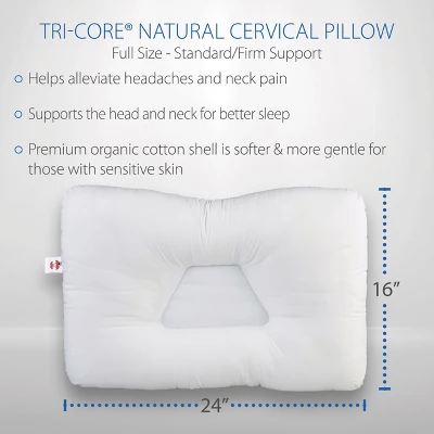 The Tri-Core Cervical Support Pillow helps alleviate headaches and neck pain by providing proper alignment of the neck while sleeping, and is commonly used to help treat a variety of conditions affecting the neck and shoulders.